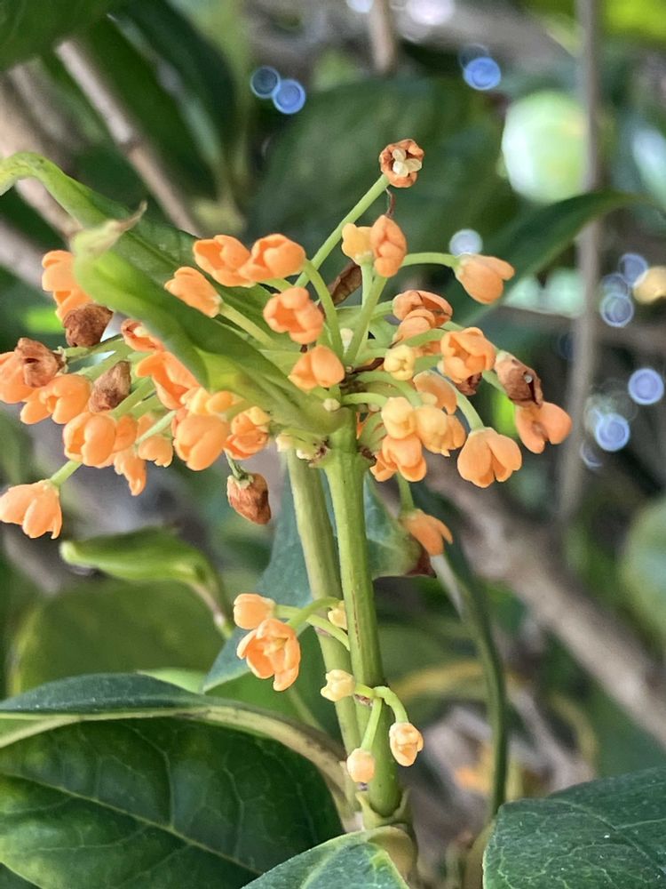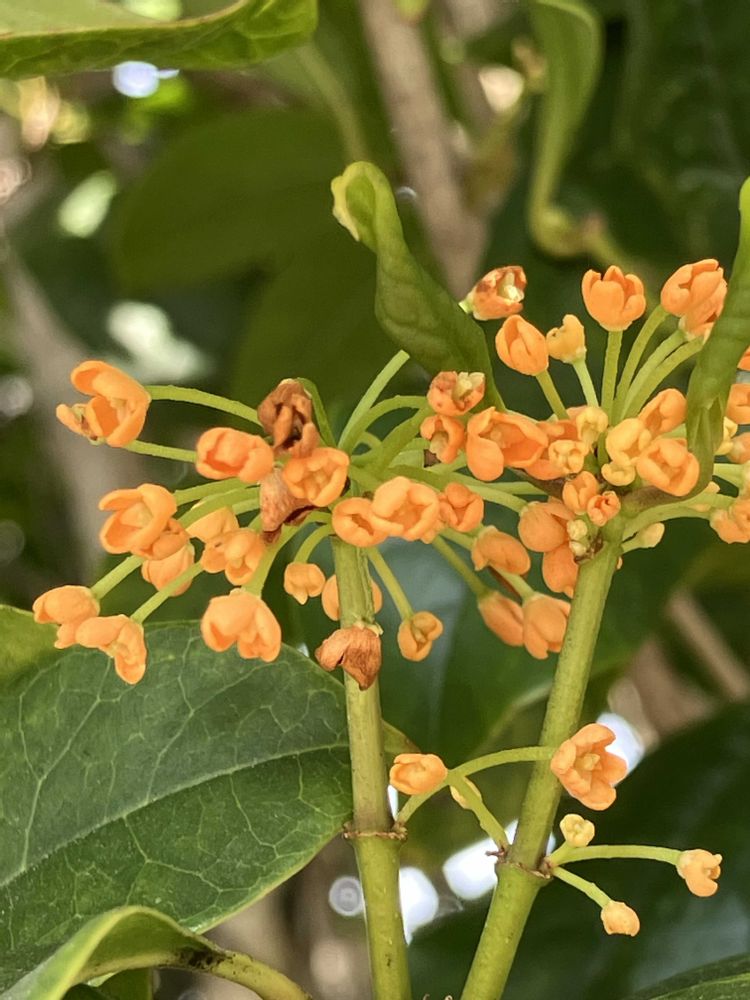 真夏以外は1年に何度か小さな花が咲く。花のオレンジ色は少し薄く、香りはキンモクセイほど強くなく、優しく甘い香りが特徴だそうです🧡