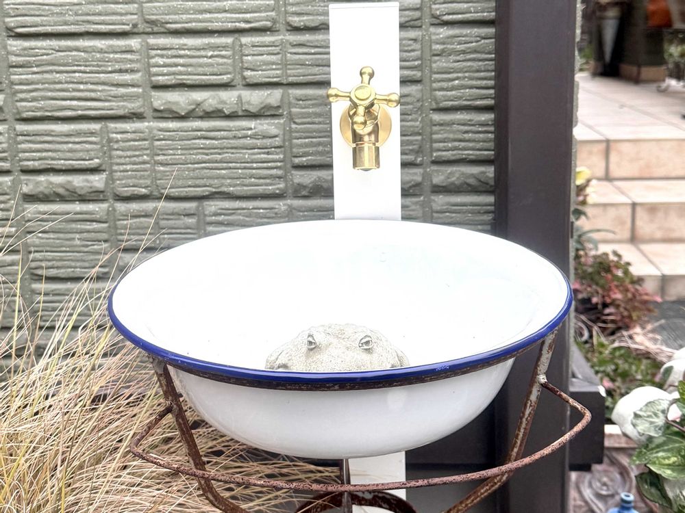 隠し持っていた、アイアンとホーロー洗面器付き洗面台をカエルを添えて設置👍