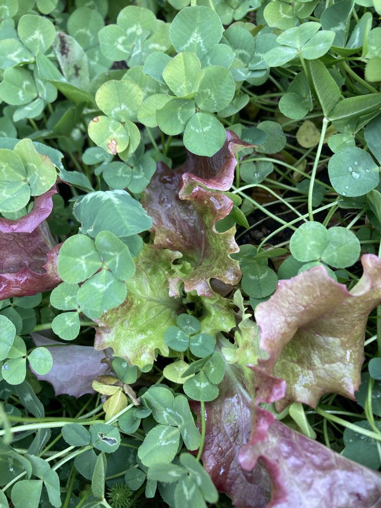 クローバー畑にしていた家庭菜園エリアから野良レタスが生えてきている 昨シーズンのこぼれ種から?