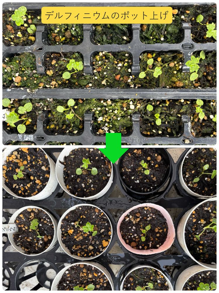 デルフィニウム、遅くなってからの種まき(12/9)でしたが、本葉がついたので、本日ポット上げしました🪴