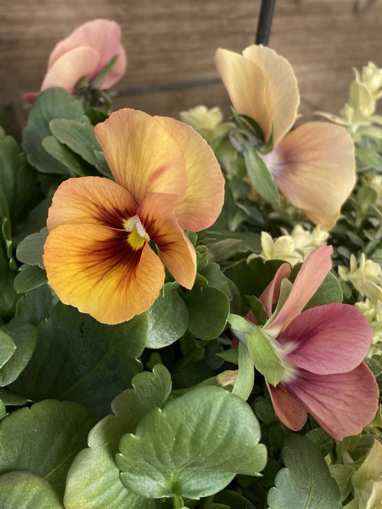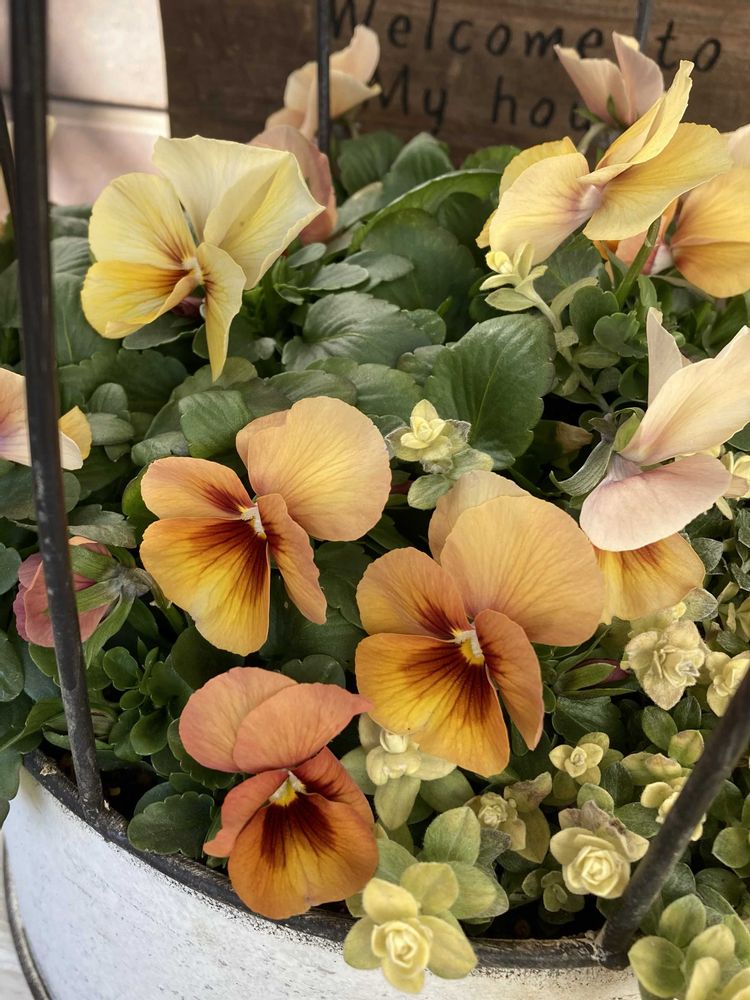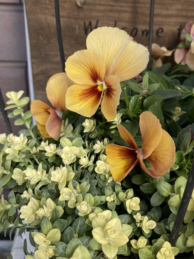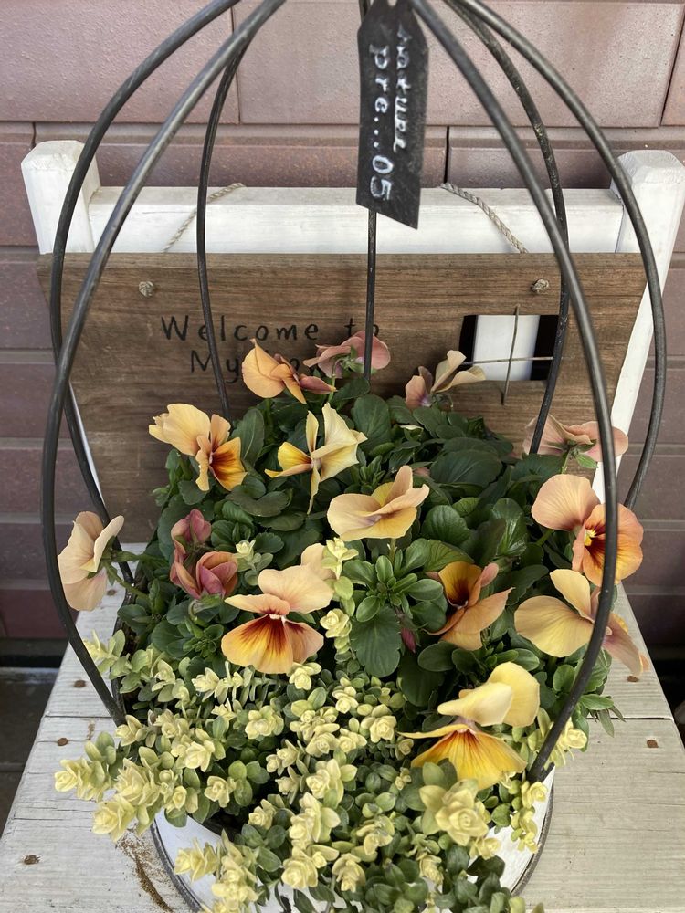 小輪パンジー「わらく アンティークオレンジ」と「ヘリクリサム ライムミニ」の寄せ植え🧡🧺🧡