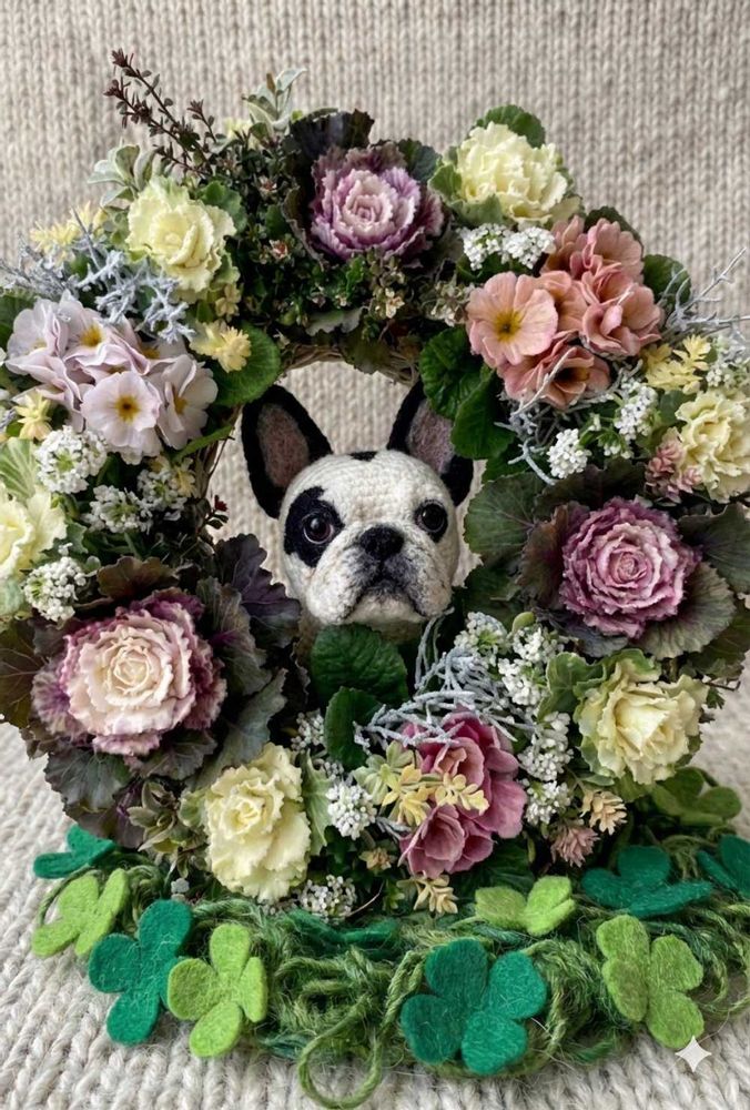 ①葉牡丹のリースからひょっこり🐶