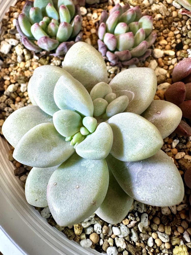2025年4月にネットでたにたのさんの苗を購入した時におまけでついてきた名無しのエケベリアが面白く育っているので、成長記録を作りました。 この子の名前ご存知でしたら、ぜひ教えてください🙏