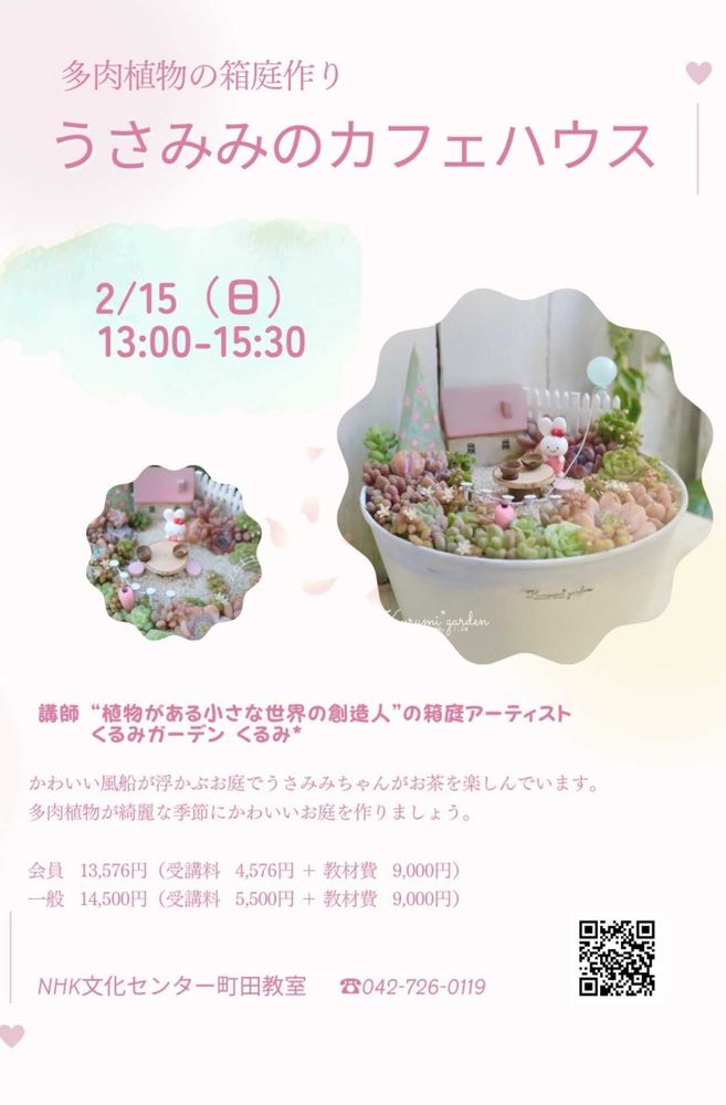 🩷2026/2/15(日) 13:00〜15:30 NHK文化センター(町田教室) 電話 042-726-0119 ※お電話またはホームページより ご確認の上お申し込みください 下のリンク⑥からもとべます 一色に可愛い箱庭を作りましょう♡ バルーン、可愛いtree、可愛いお家、 テーブルセットなど全てセットです✨ 当日、みなさまとお会いできるのを楽しみにしています💕 🩷くるみガーデンミュージアムin横浜 (JR京浜東北線 根岸駅) ※入場料1000円でお茶とお菓子付き 植物や作品の見学、お買い物やワークショップもできます。 完全予約制(住所非公開) ※InstagramのDM、くるみガーデンのメール(kurumi_garden@outlook.jp)からミュージアムの予約出来ます ※定員1〜4名まで ワークショップ(材料費込) サボテン手のひらガーデン サボテンの小鳥さん4000~ Mサイズの鉢の寄せ植え サボテンの木馬寄せ植え🎠 6000〜 Lサイズの鉢の寄せ植え 大きなサボテン箱庭 (ハウス、フェンス、小物付き10000〜 多肉植物箱庭、ガラスジオラマ、積み木のアイテム作り 🔴2024.4 フジテレビ めざましテレビ 『キラビト』出演 📕出版書籍 主婦の友社より 『多肉植物とドライフラワーのミニチュアガーデン』(第3刷) くるみガーデン くるみ* ※くるみガーデン•オンラインショップではサイン本の購入ができ、オリジナルしおり🔖のオマケ付き❣️ 🔴YouTube 、X(Twitter)、Instagramやってます 登録してもらえると嬉しいです😊 🔴『くるみガーデン』オンラインショップでは、サボテン、用土、お家、小物、ピック、寄せ植え、など購入できます 🔴Instagram、on-lineShop、WS ↓↓↓↓↓↓↓↓↓