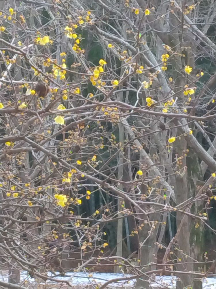 *木々の間に見えて、香りよく咲いていた蝋梅の花。