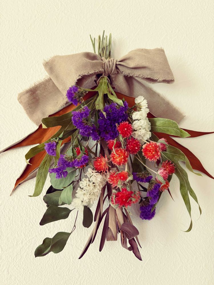 家にある素材を使って、ちょっと小さめのスワッグを作りました💐
