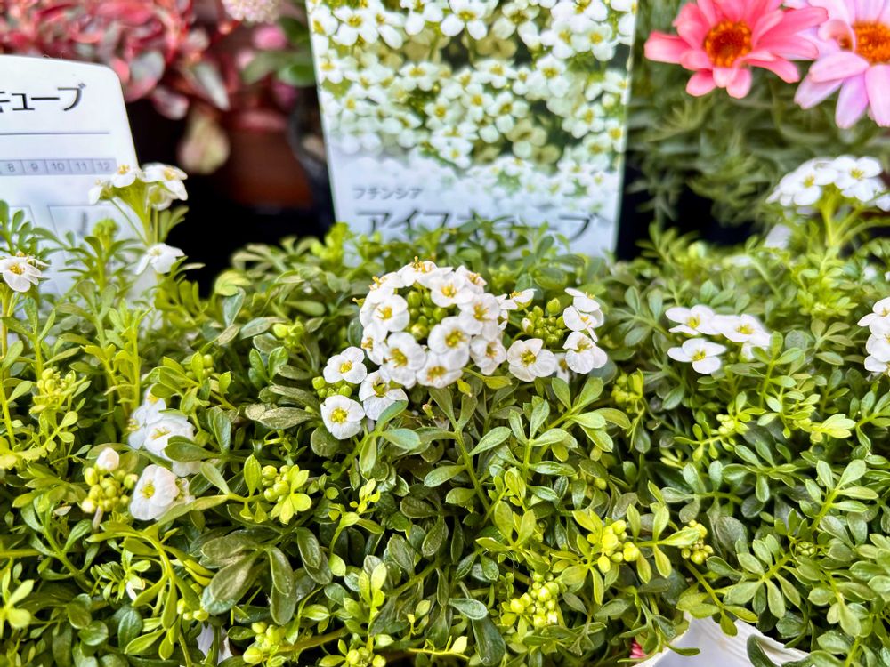 ④アリッサム欲しかったけど、いまいちだったのでMIX1ポットにしてアイスキューブというアリッサムそっくりなお花の子にしてみた。葉っぱがギザギザで可愛い💕でも夏は蒸れに弱いらしい💧