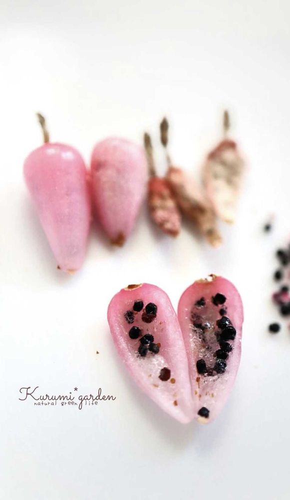ピンクの実をきれいにカットして