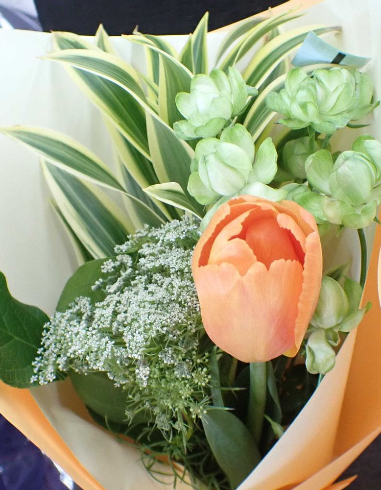プレゼントの花束、オレンジのチューリップがアセントになって素敵ですね🧡💐