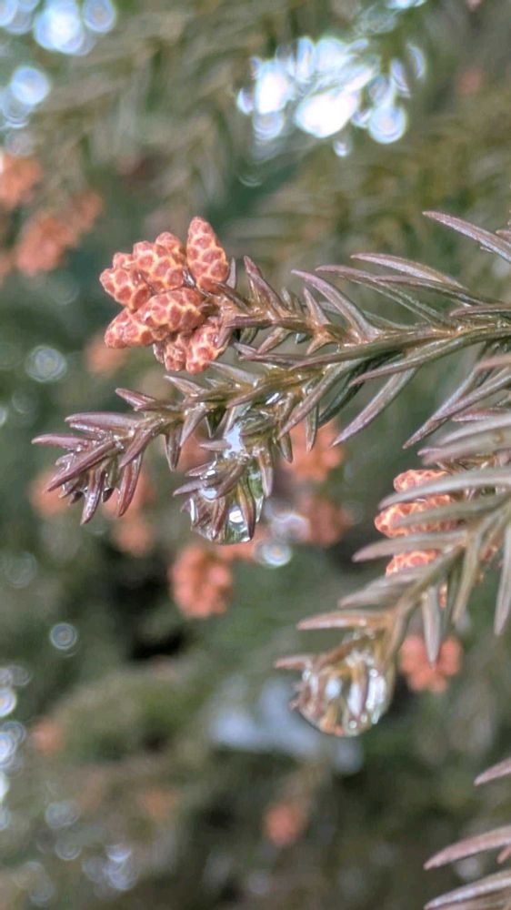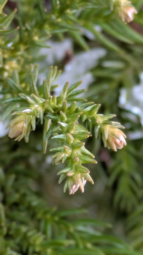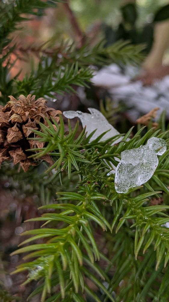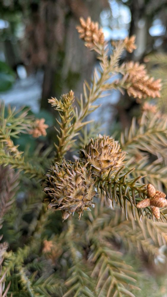 昨シーズンの杉ぼっくりが、雪が溶けた葉の間から顔を覗かせている🟤 成熟して乾燥すると、鱗片の間に挟まっている種を風に乗せる裸子植物だ♬