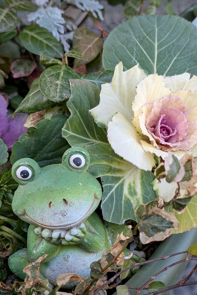 3️⃣昨日、投稿した葉牡丹の被害をふせぐために🐸ちゃんの小物置いてみたけど😂