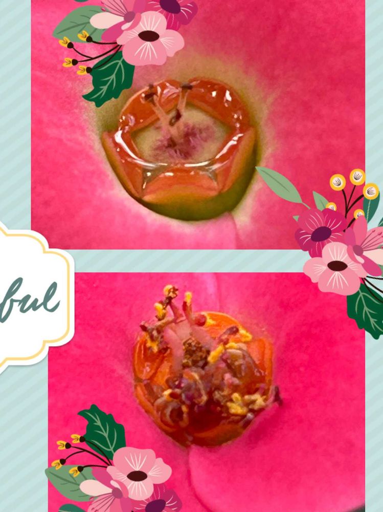 ⬆️は雌性期で、3裂し先端が2裂した雌蕊と周りの半月状の5個の腺体から蜜が溢れています