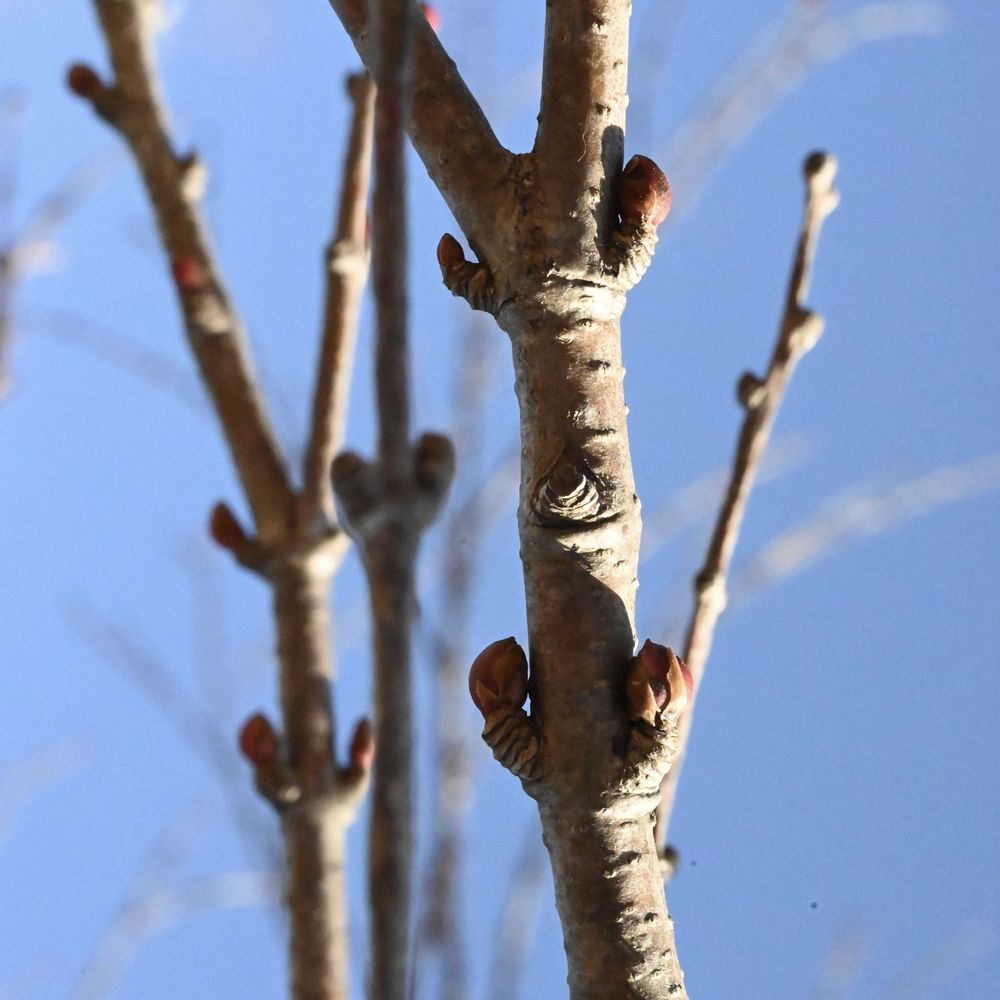 冬芽は水滴形~円錐形で赤く、ツヤがある。