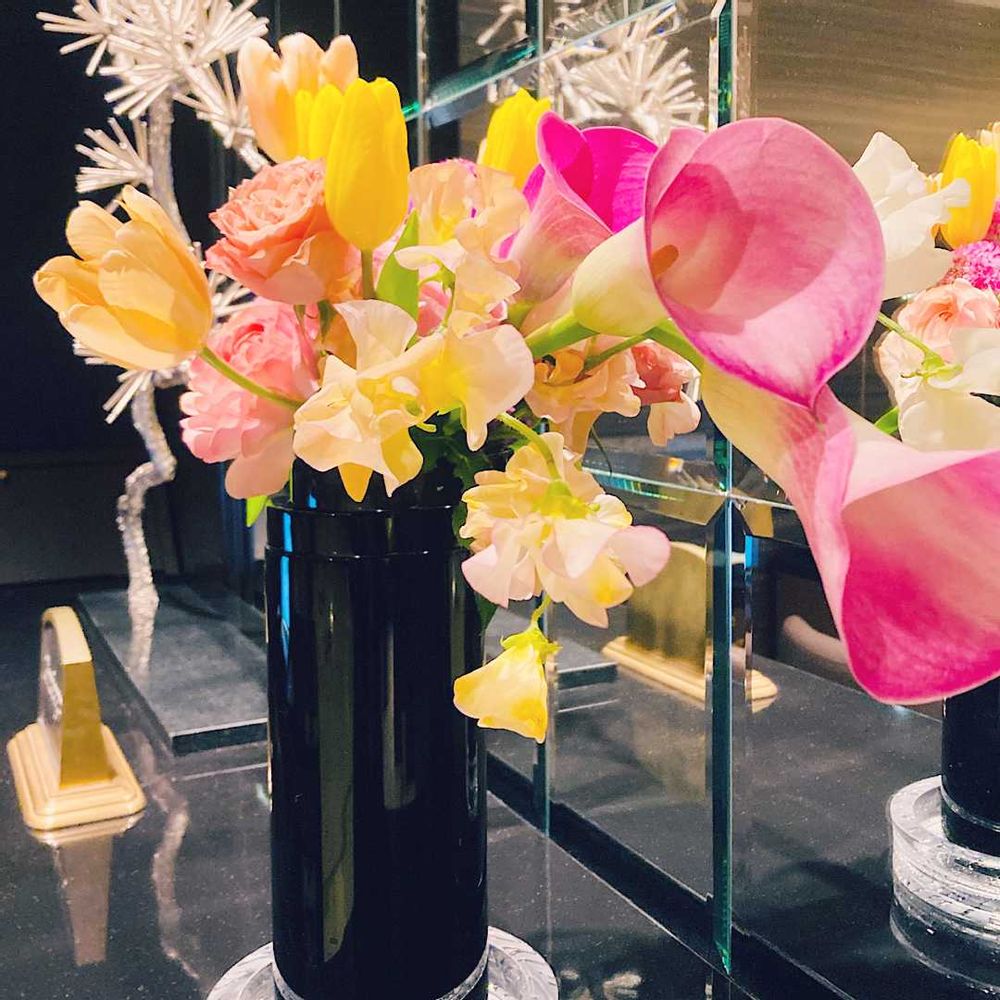 夜の会食空間に飾られていた、ピンクの「カラー」でおはようございます💐✨