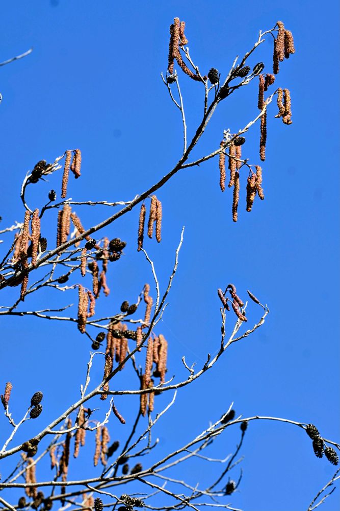 花に見えませんがハンノキの雄花、黒いのは前年の果実だそう。