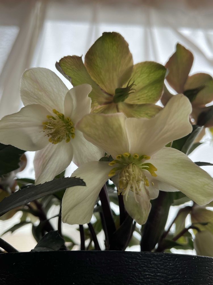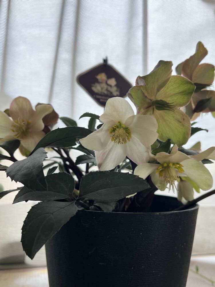 クリスマスローズ、マホガニースノー、今年購入で、2階の東側の出窓に鉢植えで置いてあります♡