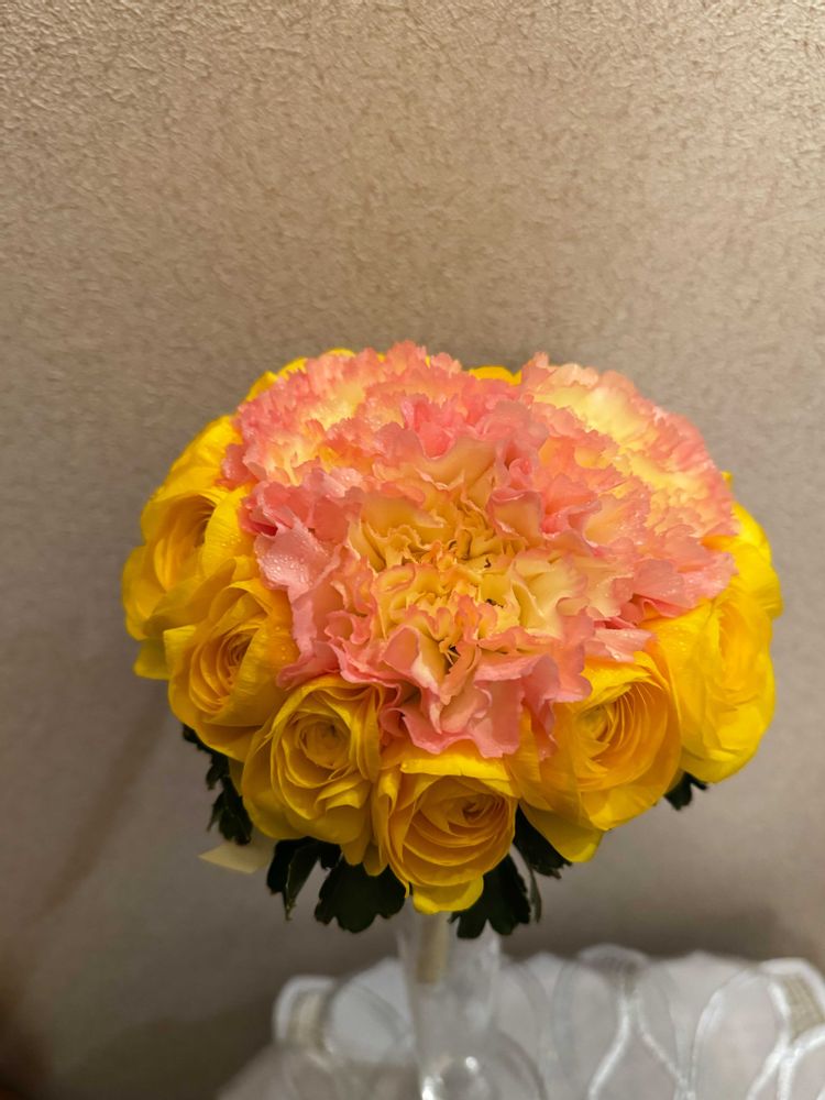 黄色のラナンキュラスが縁取りに🌼中心のウスモモ色のお花はカーネーションです✨🌸 娘作