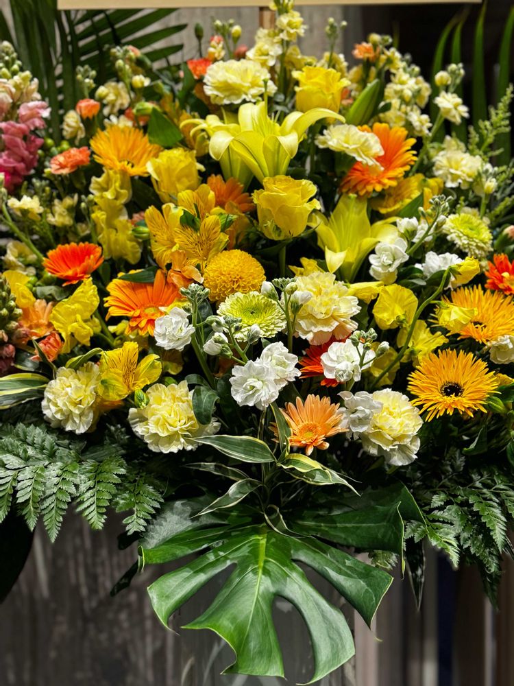 黄色のバラを中心にガーベラ、カーネーション、マム、ユリなどが入っているフラワースタンド✨ コンサート🎵にて