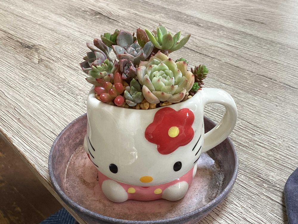 お土産のコーヒーカップを穴開けて多肉鉢にしました