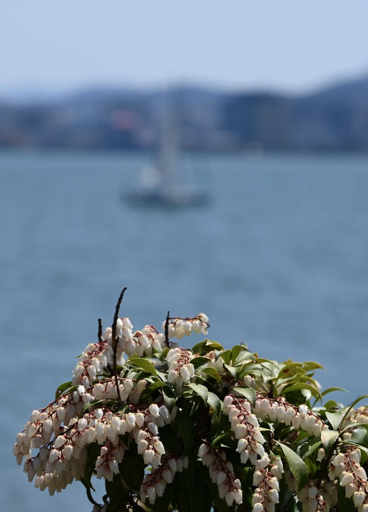 琵琶湖とヨットを背景に馬酔木が咲いていたのでコラボしました•*¨*•.¸♬︎✧︎*。