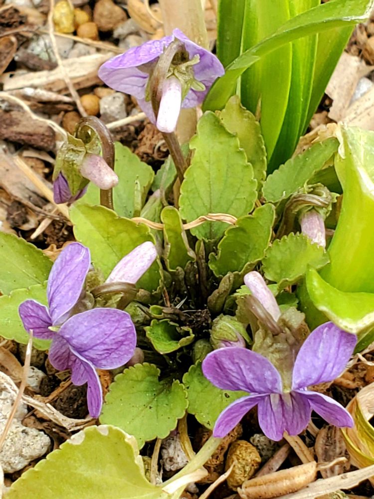 ③ ダイヤモンドリリーの鉢から、可愛いスミレが顔を出しました💜