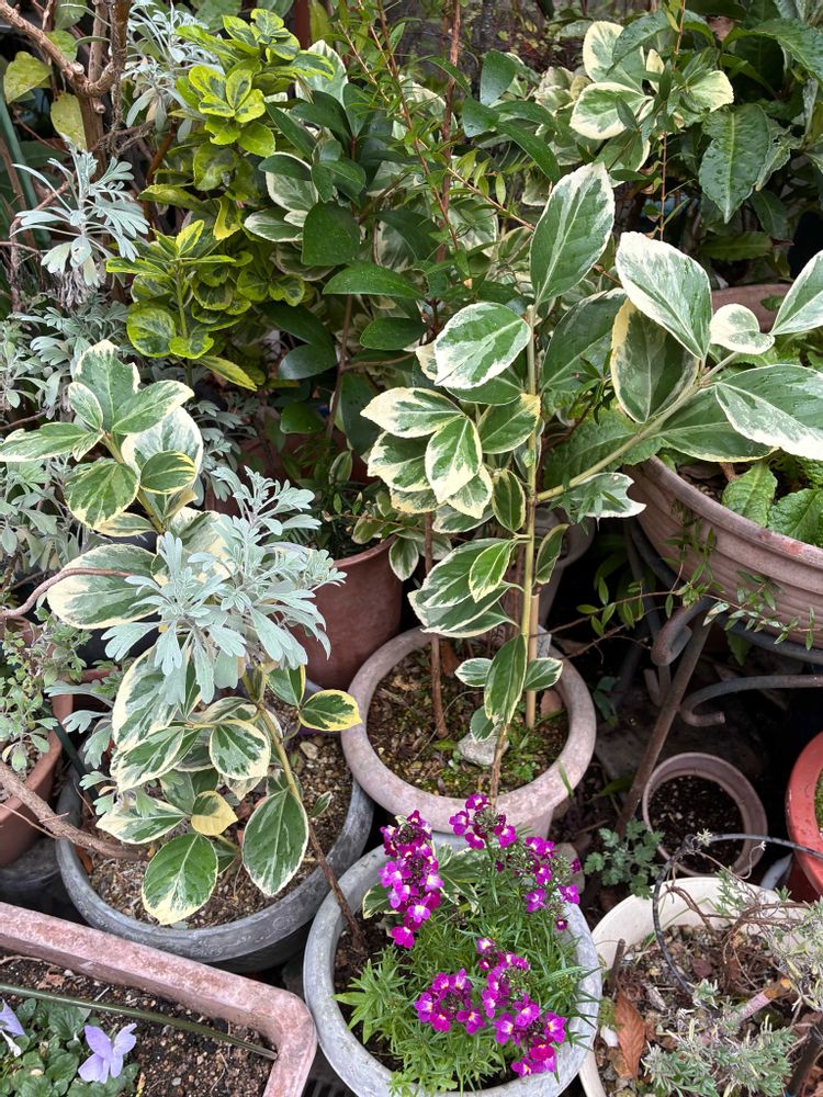 奥の方にいた斑入りマサキの鉢を引っ張りだして リナリア植え込みました。