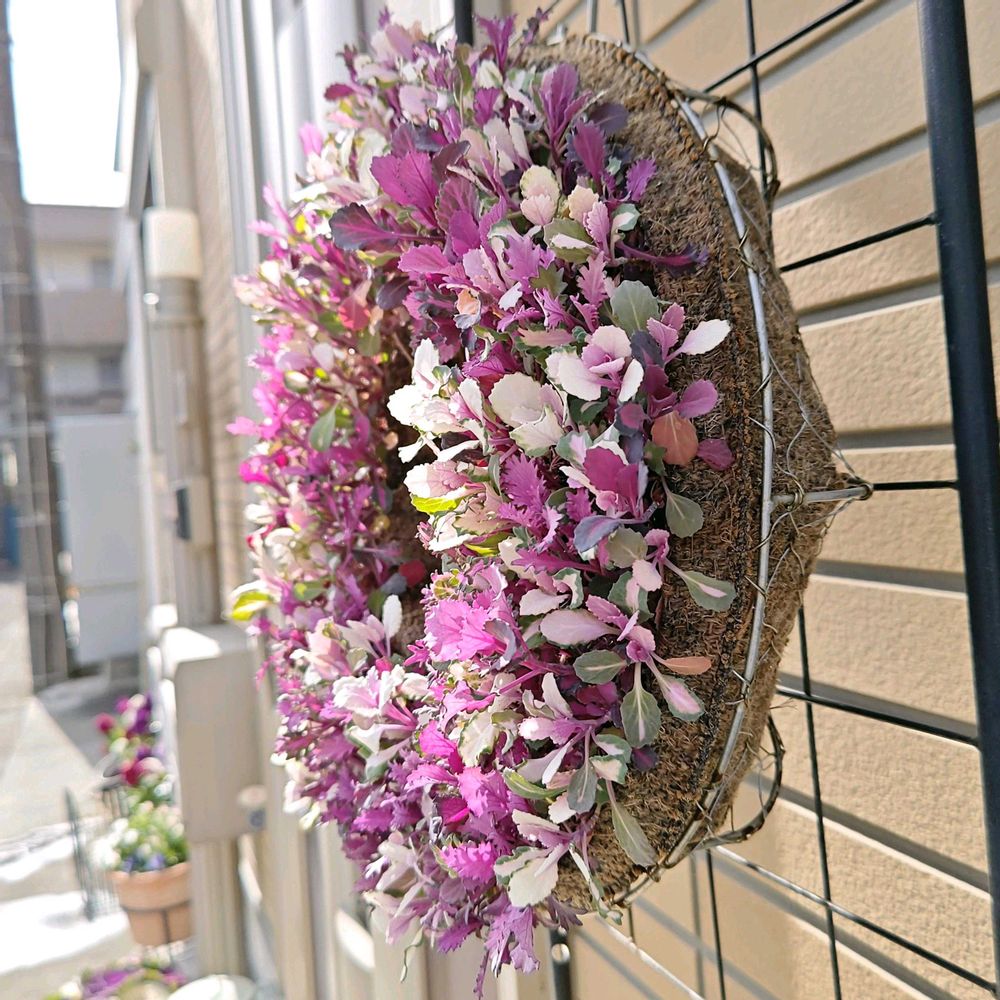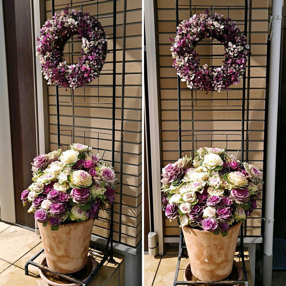 寄せ植えの方は色褪せが始まっているので、リースもそろそろ色褪せるのか? でも小さいから花芽は出来ないと思うので(葉牡丹は株がある程度の大きさになってから一定期間寒さに当たらないと花芽分化しない)、どんどん色戻りして緑色に戻っていくのかな?
