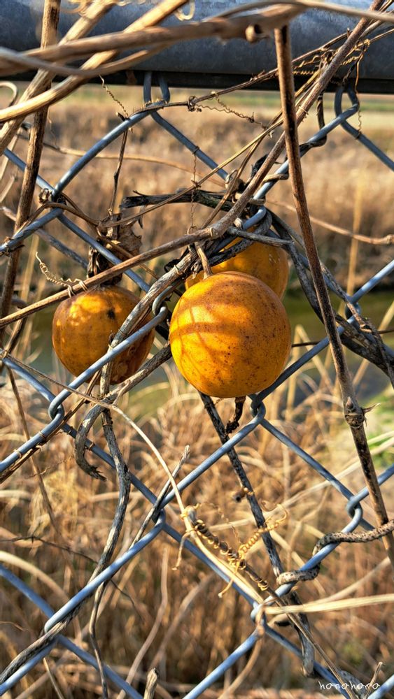 黄烏瓜の丸い実が猪除けのフェンスに絡み付いていました。