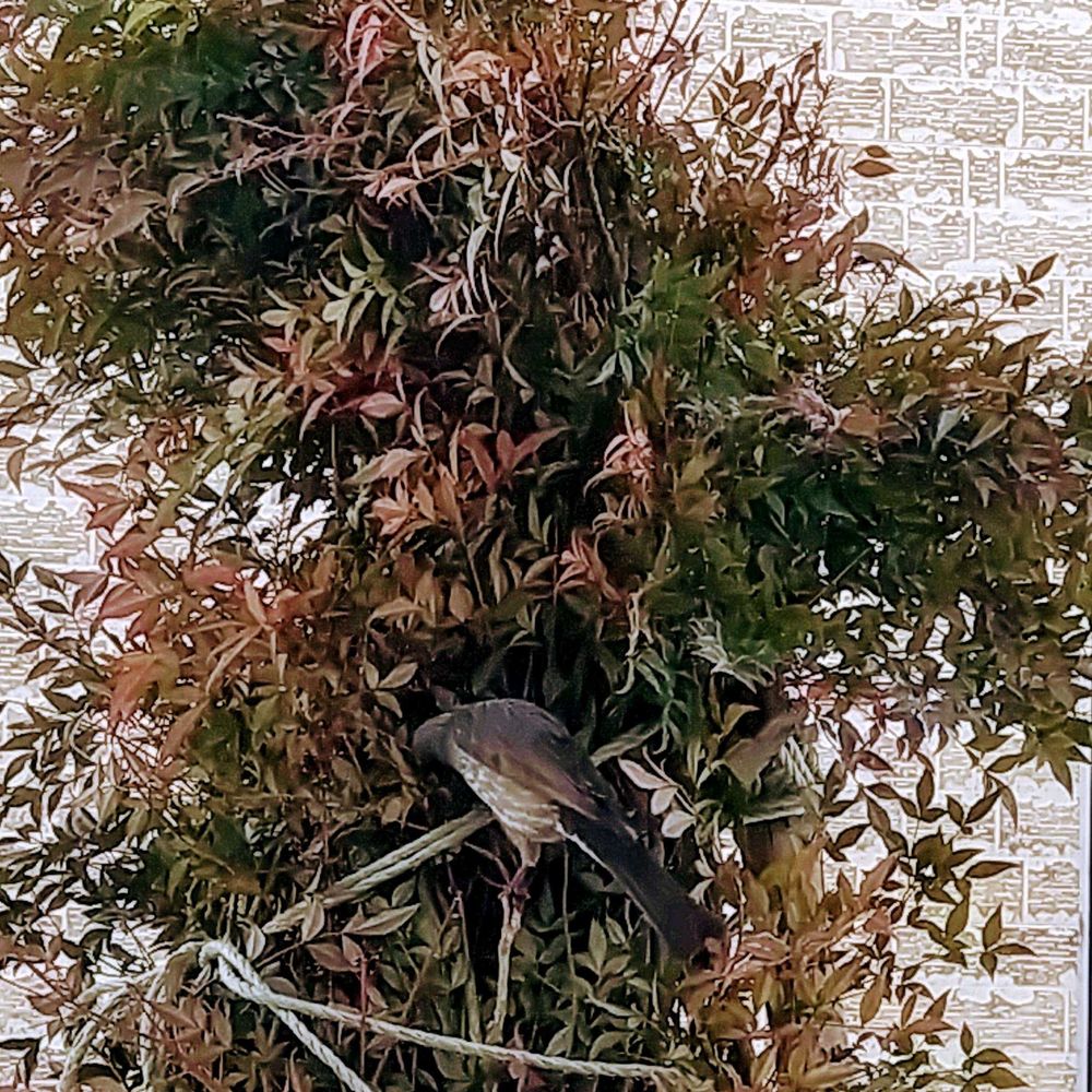 ④2025.2.15 ヒヨドリが南天の冬囲いした処でお食事中!