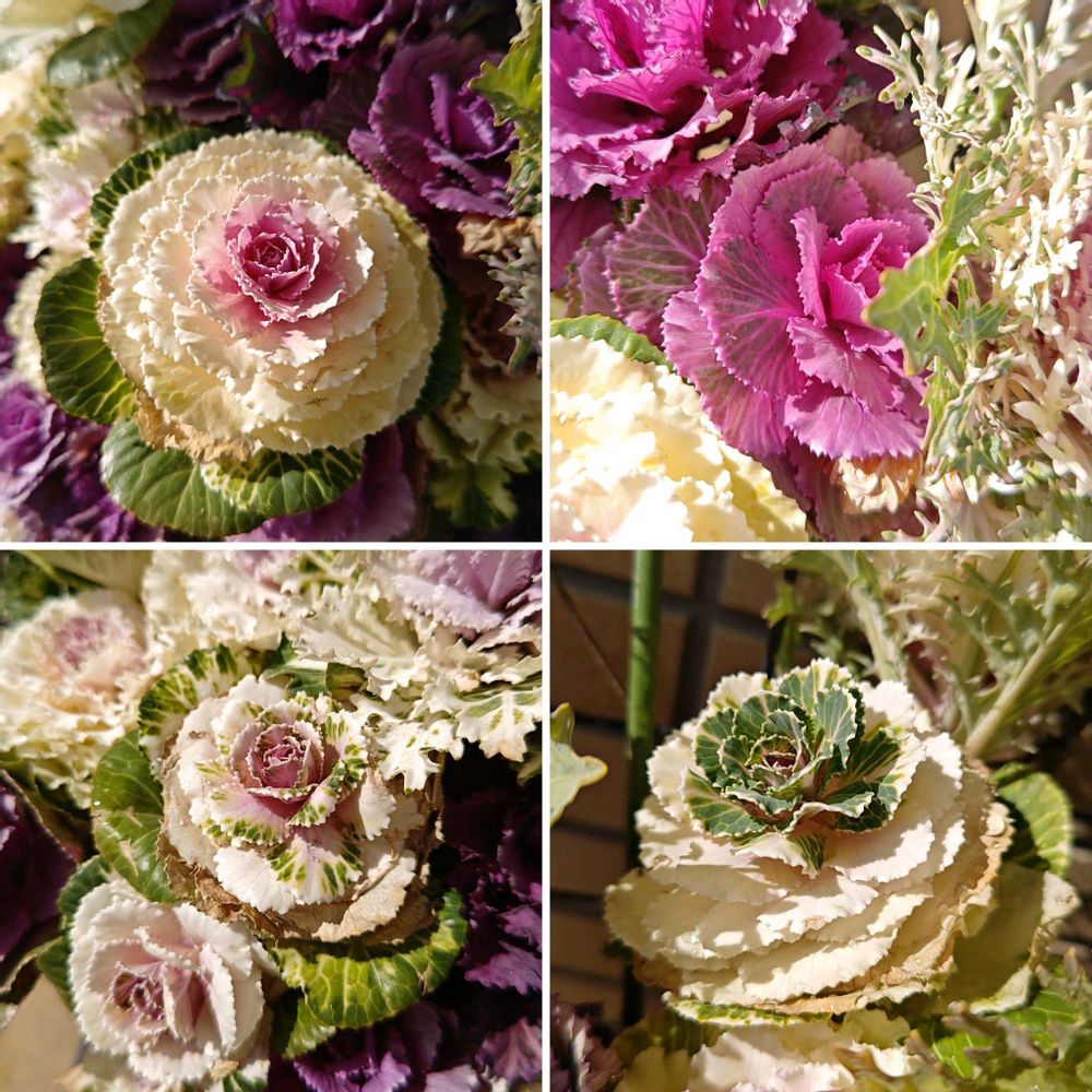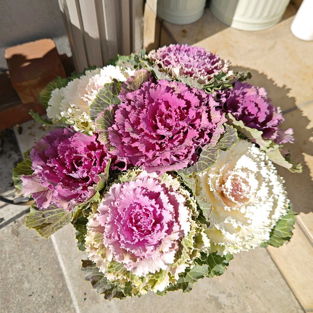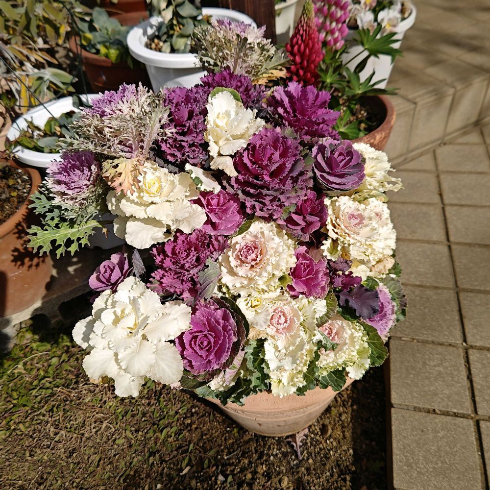 【1枚目】葉牡丹の寄せ植えはピークを過ぎてしまったようで、少し色褪せてきました。少ーしトウ立ちし始めたものも有り。もう終わっちゃうのかー😢