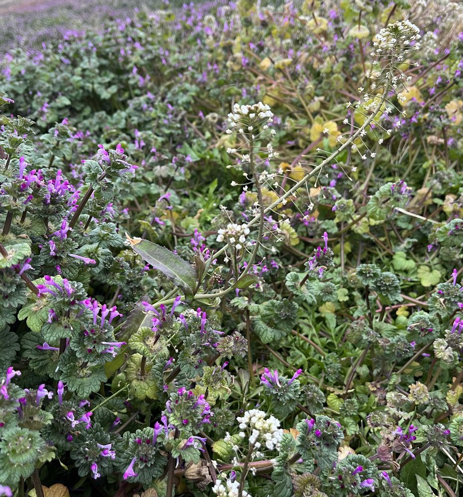 今日のお花がなかったので代わりにナズナとホトケノザを投稿しますね😆👍🌿🤍💚💜🩷 コラージュ無しです😆👍 ホトケノザの群生の中に、いくつかナズナが咲いていました😆👍🌿💜🩷💜🩷🤍💚 可愛らしいです🥰💕✨