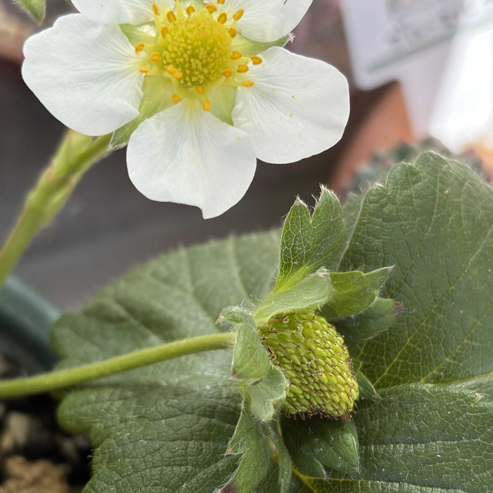 イチゴ、まだ蜂が来ないから自分で受粉🍓
