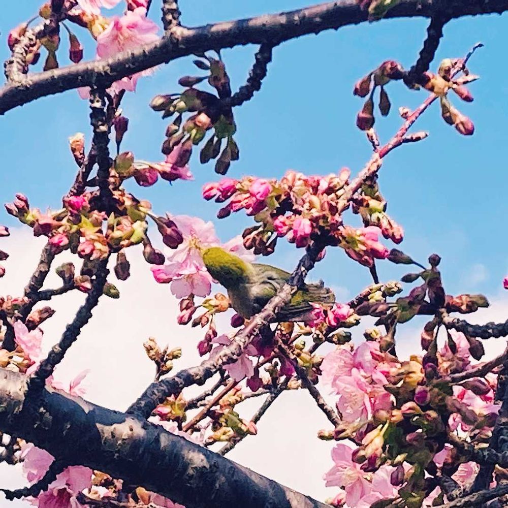 ピンクの世界を待ってました〜❣️とばかりに、可愛いメジロが次から次へと、花開く河津桜を歓び飛び回りながら、花先に嘴を入れて花蜜を器用について堪能していました😊☀️