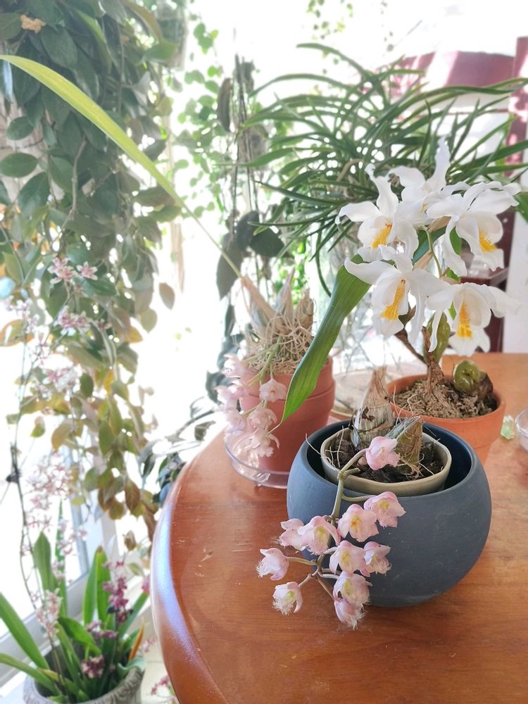 hoyas & 香りの蘭+α の愛しい時間.。.:*♡ 観葉初心者でしたが、何故かhoya 沼に。 香り・根っこ・バルブフェチです😺 ●蘭展 1.2.3.6は香り診査月♪ なぜこんなに、ホヤにはまったのか不思議でしたが、思い当たる部分は体質?? 🔹根っこが小さいのにカチコチの丈夫な葉っぱ 🔹シナシナした湿っぽさがなく、カラッとしてる 🔹観葉なのに花が咲いて良い香り。しかも狭い程咲く 🔹穏やかな日陰好き 🔹大して世話がかからない ちなみに蘭は?というと 🔹テクスチャーがホヤ似 🔹香り◎根っこ◎バルブ◎ 🔹邪魔にならない存在感と品格、人を誘い込む巧妙な香立ち・・・ そんな感じでしょうか🐦 小さい雀と、緑の精霊が佇む空間で暮らしています🪺✨ いつか、果樹とオージープランツのバルコニーも欲しいなぁ(*´ω`*)