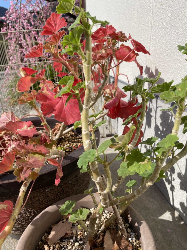 ⑤ゼラニウム、同時に挿し芽しお花はピンク 軒下に置いていた方は赤い葉っぱがキレイ♪