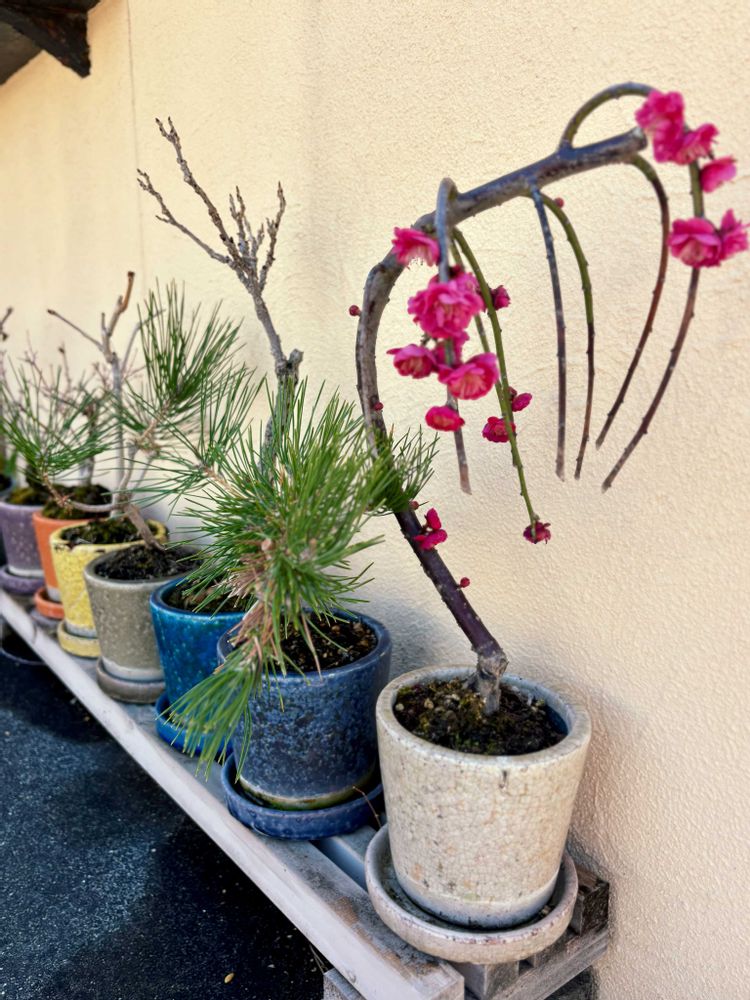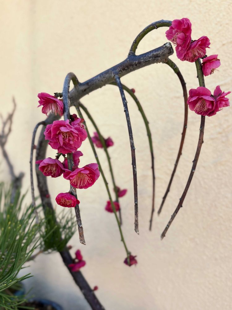 今日のお花はウメなので、我が家の開花中の枝垂れ梅の盆栽です。