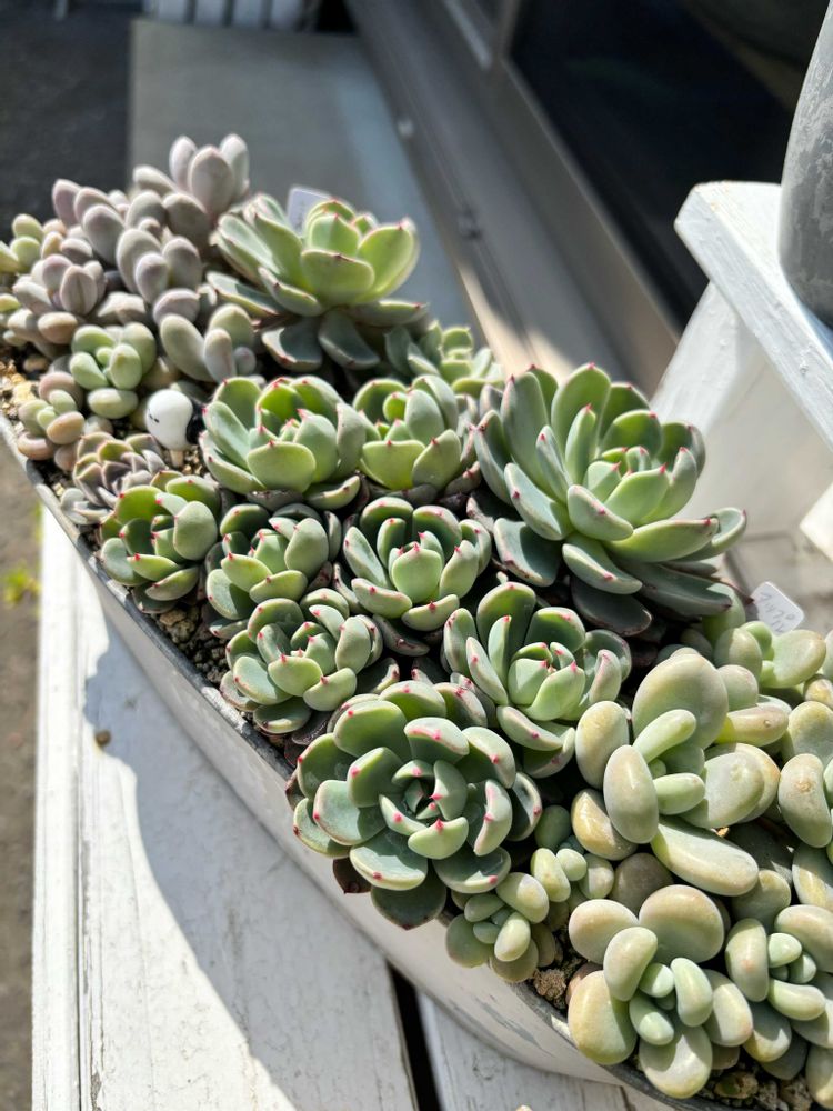こんにちは😃♫七福美尻とオパリナとアップル美人の子株たち植えてる寄せ植えです。だいぶ大きくなってきたかなーーぎゅうぎゅうもまた可愛いけど蒸れが心配になってくる😅