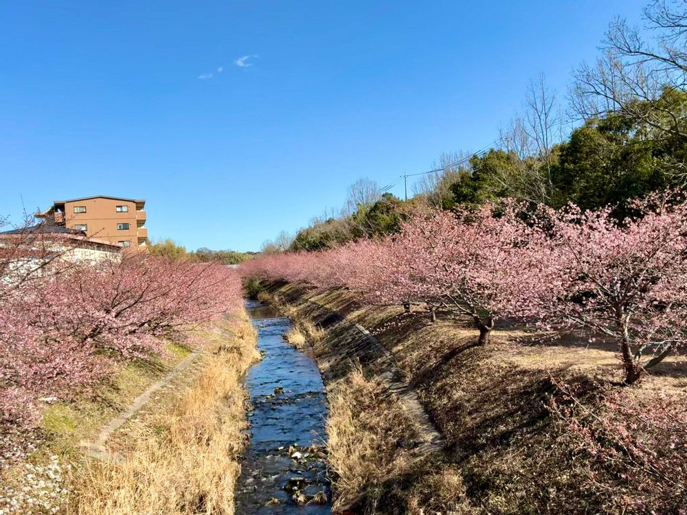 浜松西ICから車で約5分。花川堤防沿いの両サイドに約400本の河津桜が植えられ、ピンク色に染まった優美な花街道を見せる。住民有志が荒れ果てた河川敷を管理して、花川沿いに河津桜を約400本、ソメイヨシノを130本植樹。18年が経過した現在も毎年10本ずつ増やしており、東大山橋から上流約1キロにわたる河津桜並木は県西部最大の規模を誇っている。2026年2月14日(土)~3月中旬の9時~16時には、東大山河津さくらまつりを開催。花川の両堤防を彩る河津桜と菜の花畑で彩られた春景色をゆっくりと堪能できる。