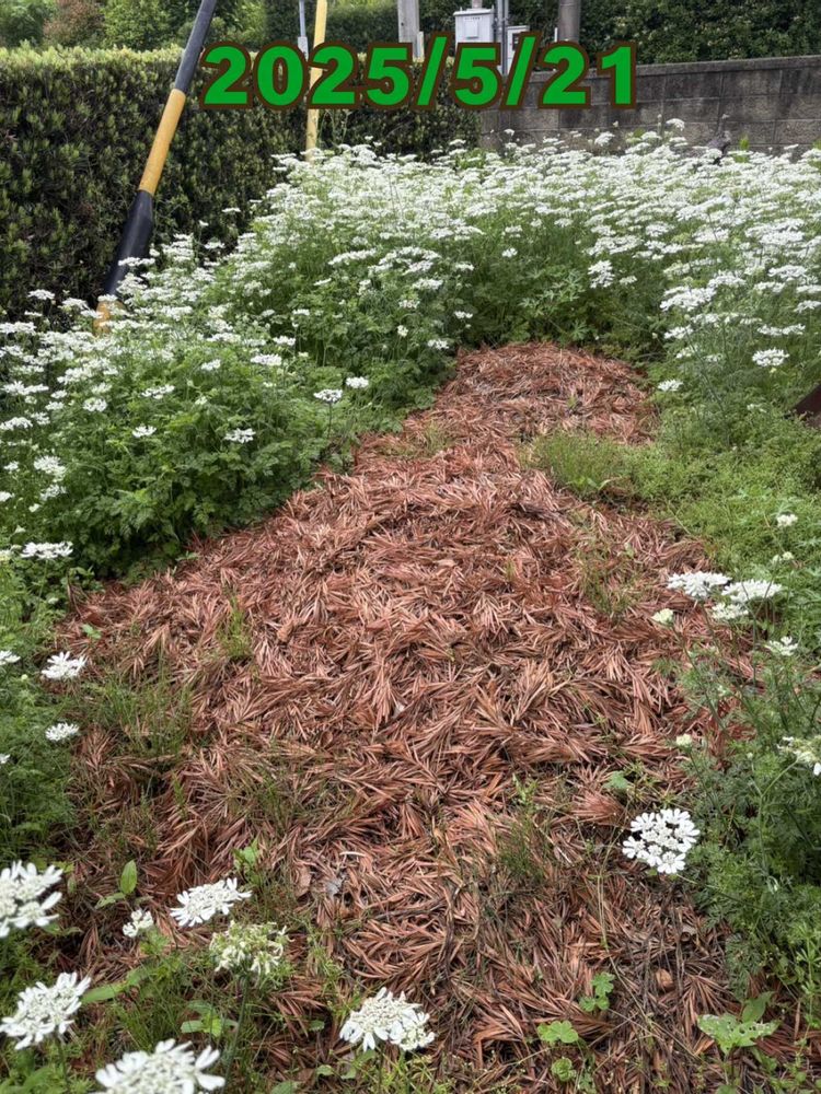 薄いピンク色のストックも咲きました🩷今年は全体的にストック遅かったなぁ。矮性の背が低いキスミーちゃんたちが1番早く咲きました。背の高い子たちはまだです。2025.5.21に垣根を剪定した後の落ちた葉っぱを西側の余ってる土地に捨てた、2026.2.19にスコップで掘ってみたらなかなか良さげの土になっていた。