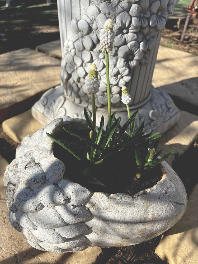 白いムスカリどんぐりの鉢に
