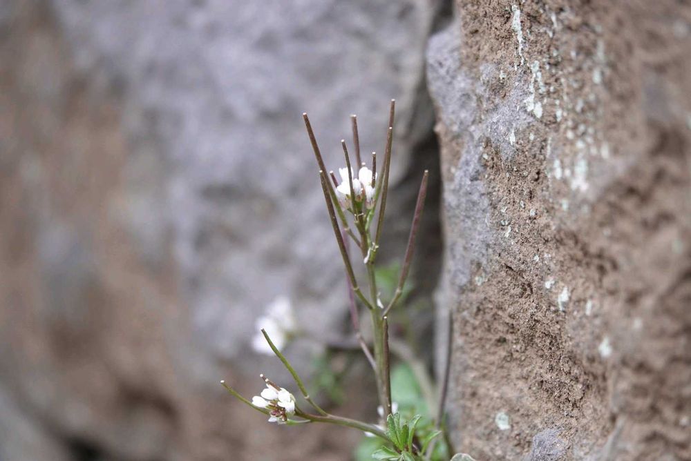 ミチタネツケバナ(2枚目)の花の周りにガードマンのようにバンザイしているのは果実。熟すと弾けてタネを飛ばす。では、花はいつ咲いたのかな?もしかして閉鎖花のタネかしら?
