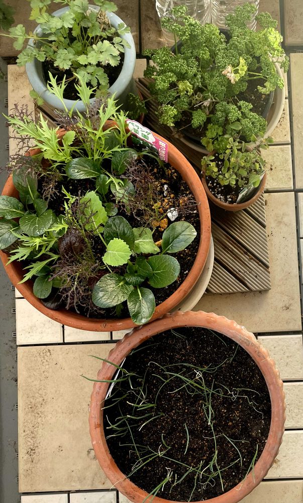 バルコニー菜園。奧からパクチー、パセリ、ミックスリーフ、オレガノ、小葱です。順調に生育中。
