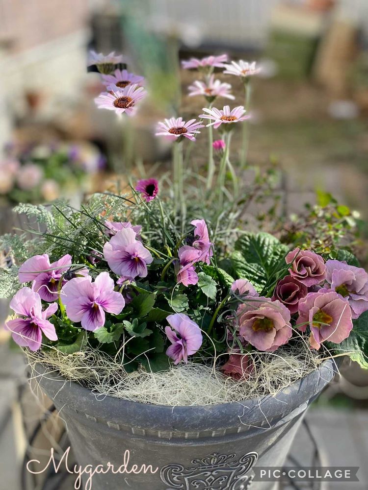 こんにちは🌞 グレーピンクの寄せ植えが鉢の色グレー🩶に合って素敵です💓