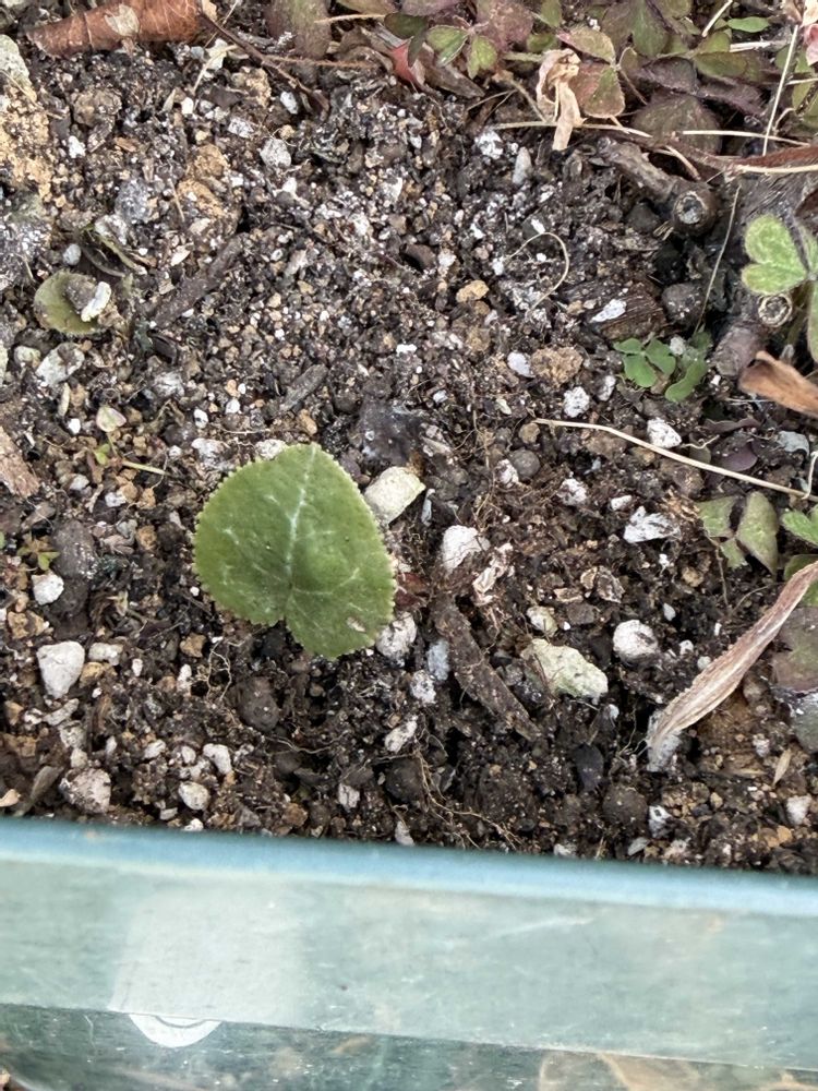 ⑤バラのポットの雑草を取っていたら中に原種シクラメンの芽を見つけました🌱
