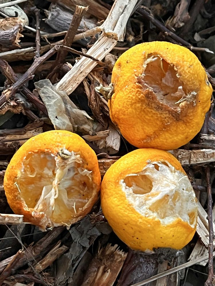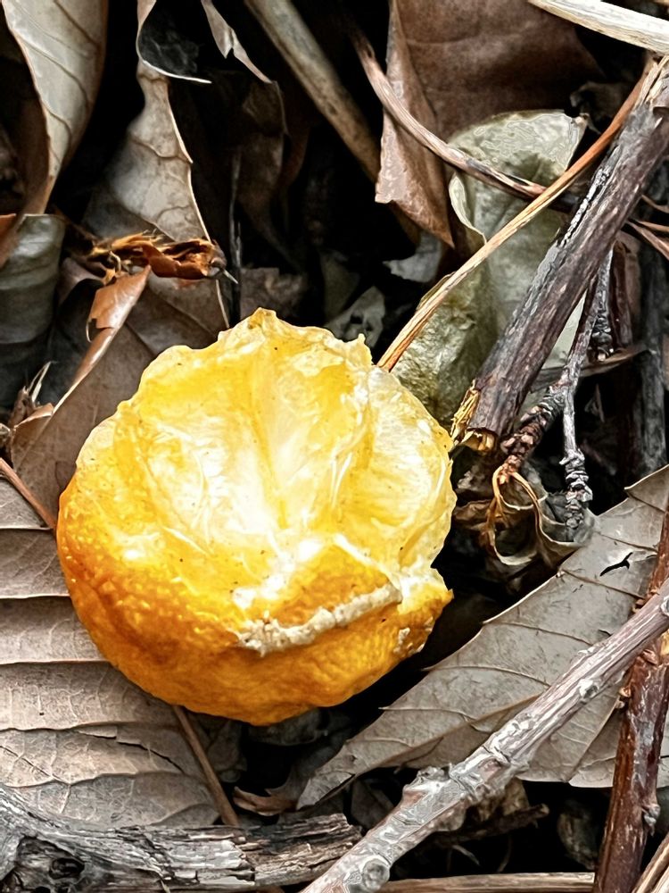 食事をした場所には皮が散乱し、果肉を食べたユズの残渣がいくつも転がってます。