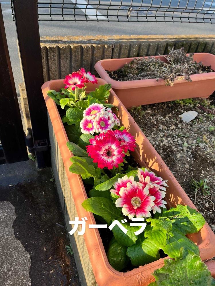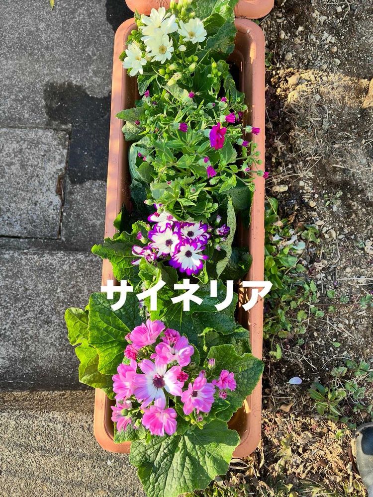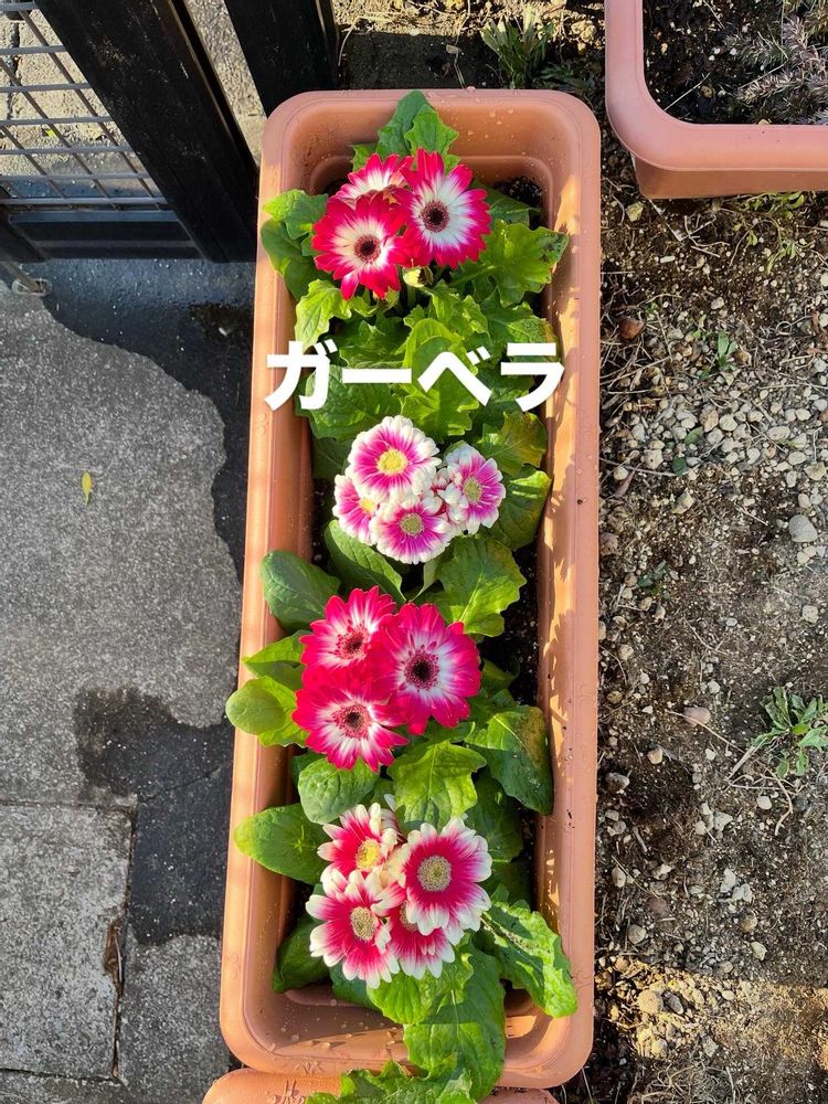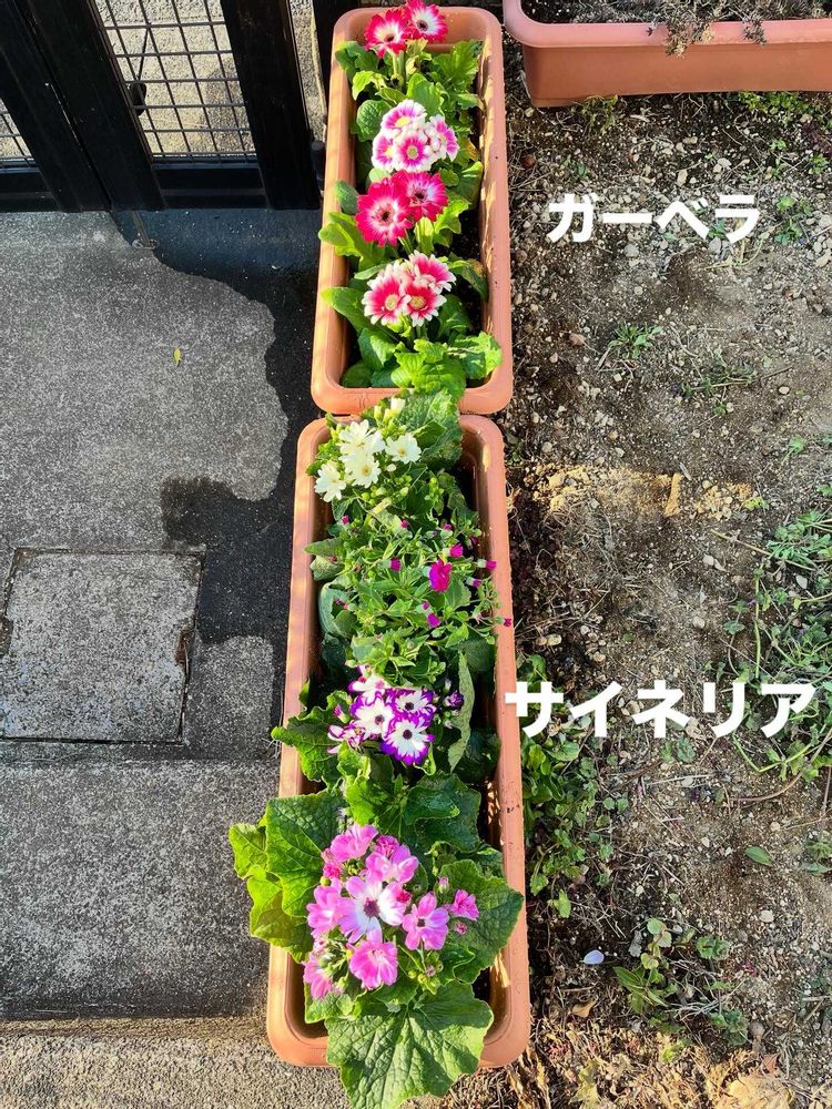 カインズで、長い植木鉢2つとガーベラとサイネリアと土を購入