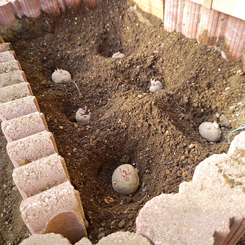 ジャガイモは酸性気味が好きらしいので、草木灰やバッドグアノ、もみ殻くん炭、有機石灰などは入れませんでしたが、ぼかし肥料を入れたのでそれはどうなのかな? 土にピートモス(酸性)を混ぜたので何とかうまく育って欲しいです🙏