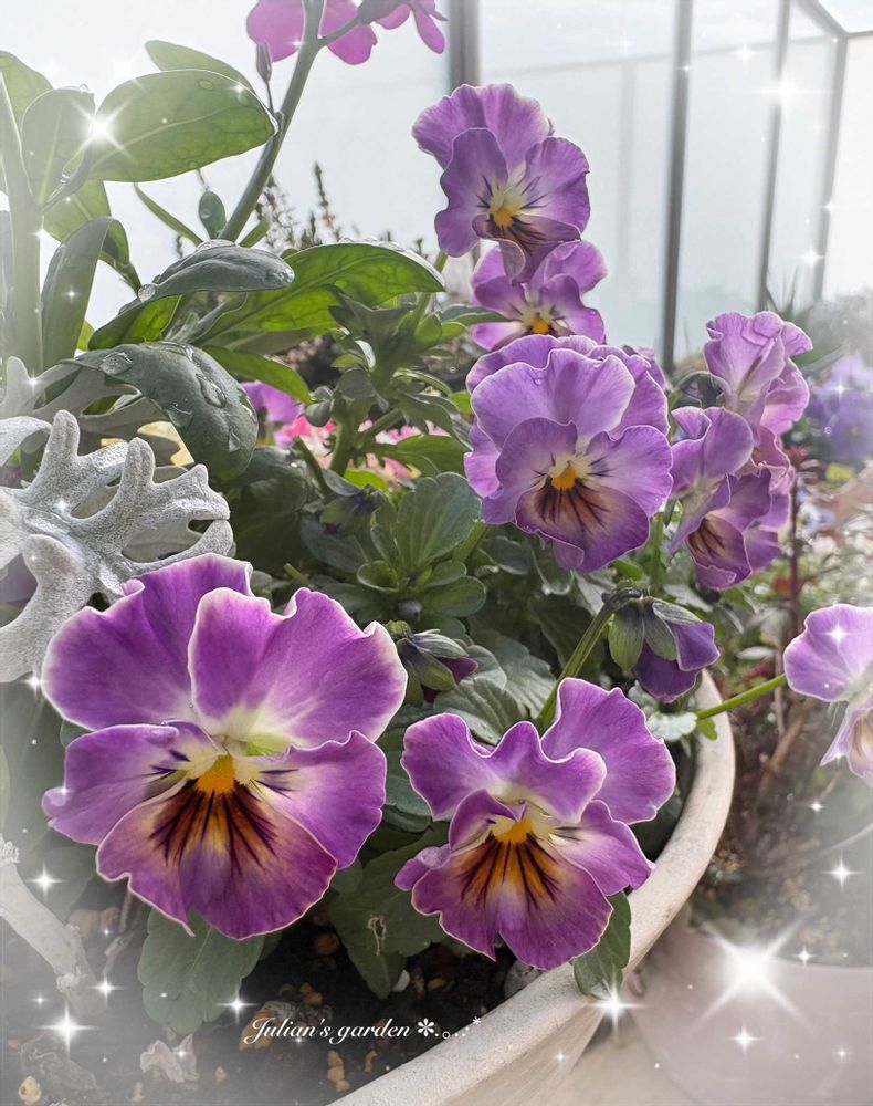 ①寄せ植えに入れた ビオラのモココ💜縁どりが白くて可愛いです💓