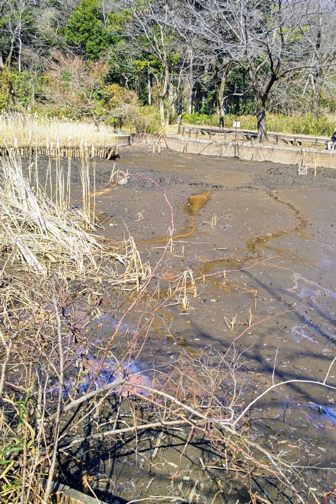 池の水を一次的にすべて抜き、底を天日干しにする。水質の改善や外来種の駆除、水草の再生を目的とする。