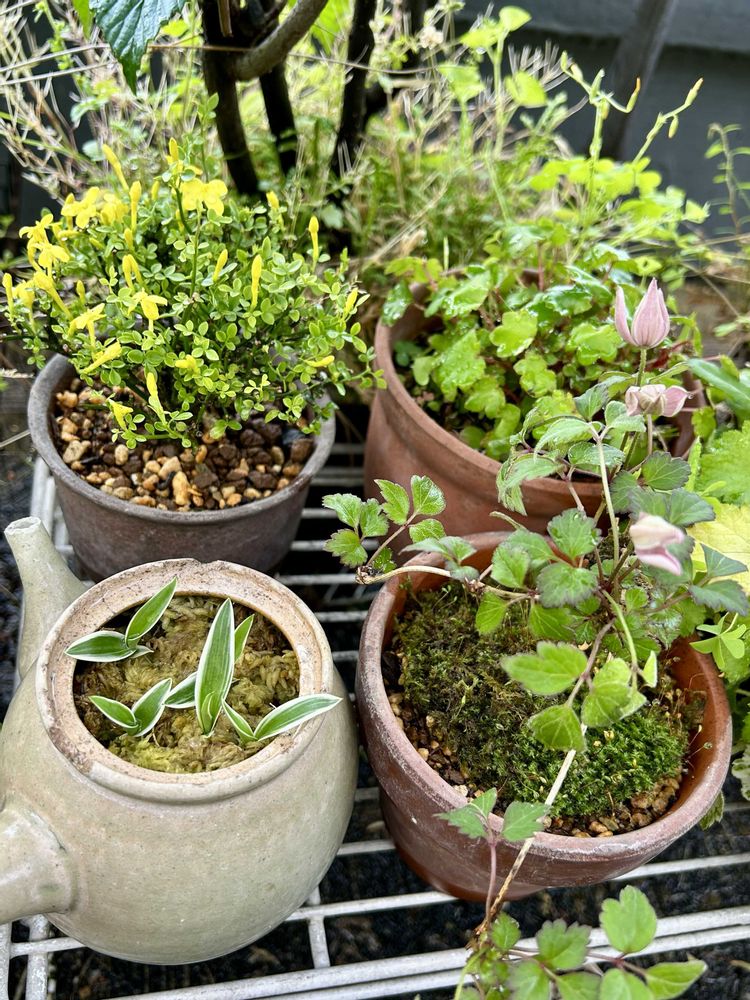 ①まるで小鉢を並べたお膳のよう。バルコニー小庭の春の山野草(。•ᴗ•。)♡